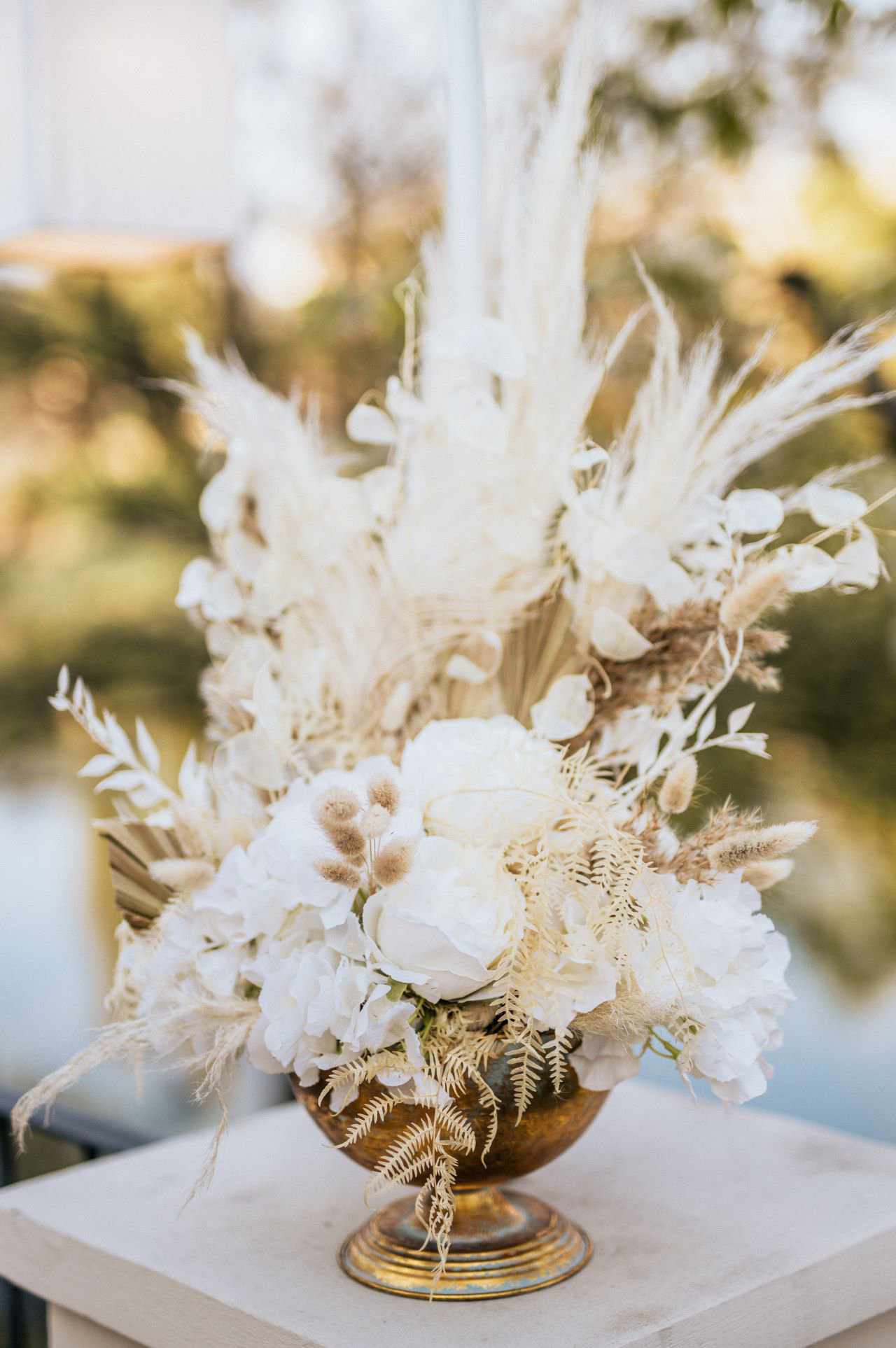 Természetes hatású, elegáns dekorációs csomag szárazvirágokkal, pampa díszítéssel, élethű selyem- és gumivirágokkal. A dekoráció egyes elemei igény szerint variálhatók, hogy tökéletesen illeszkedjenek az esemény stílusához.